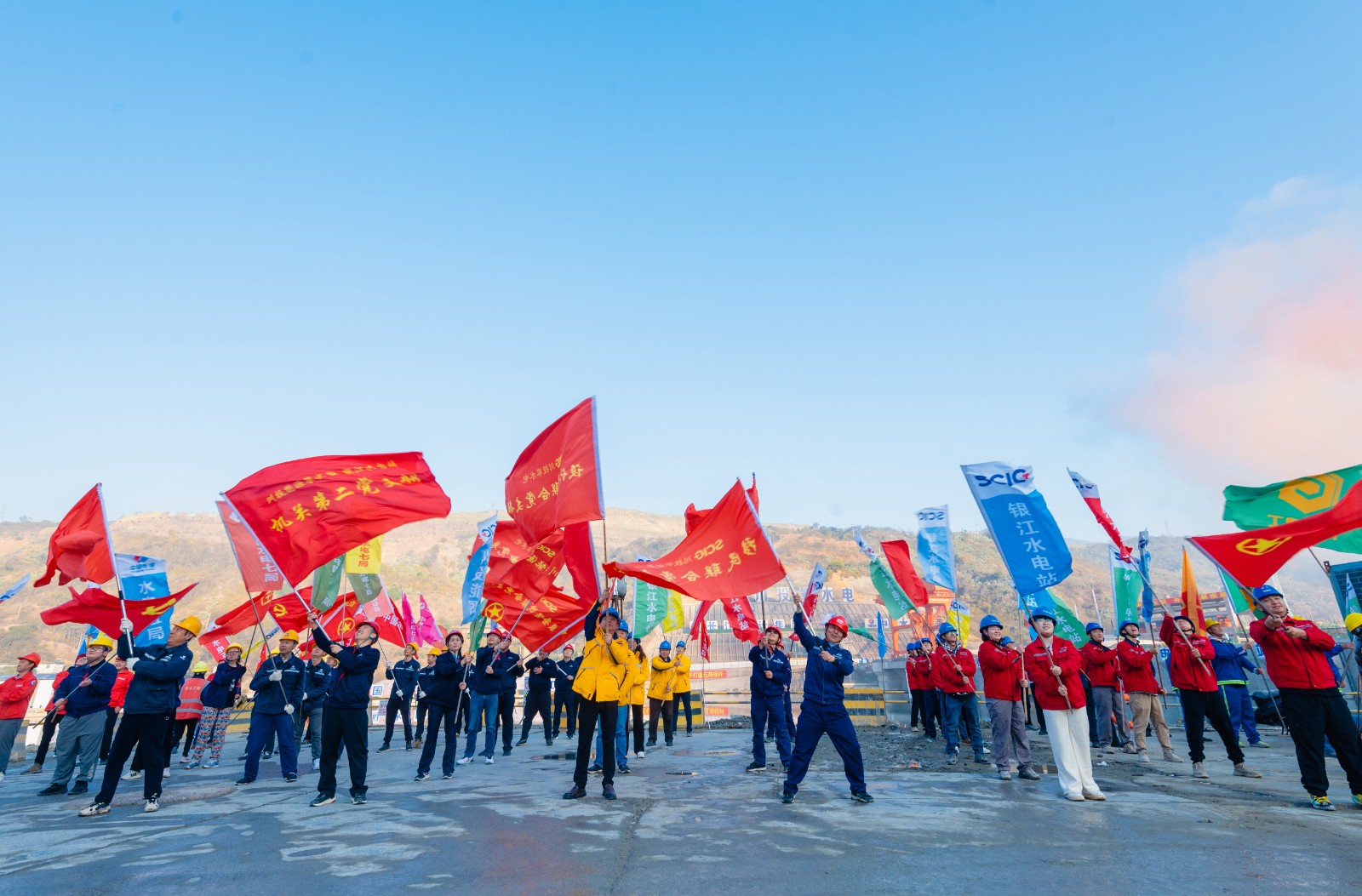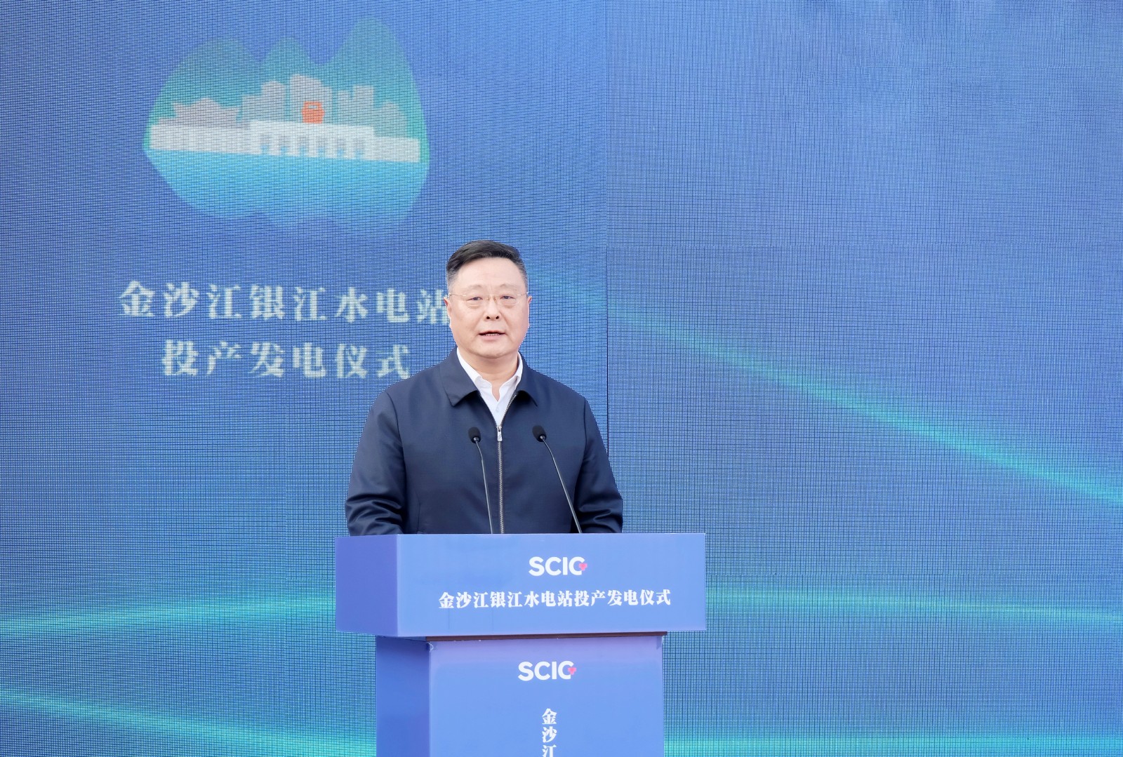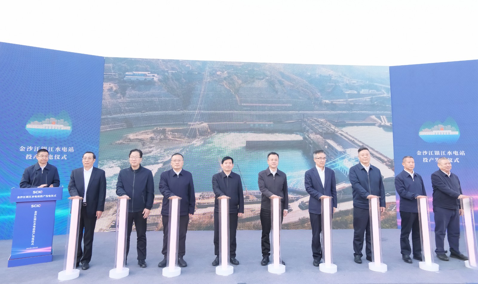 上午9时许,,,,,,,,随着仪式现场下达首台机组开机发电指令,,,,,,,,吴群刚、吴晓曦、范继跃、李文志、林开国、李仁杰等向导按下启动柱,,,,,,,,配合启动金沙江银江水电站投产发电,,,,,,,,标记着该水电站提前一年实现投产发电目的。。。。。。。