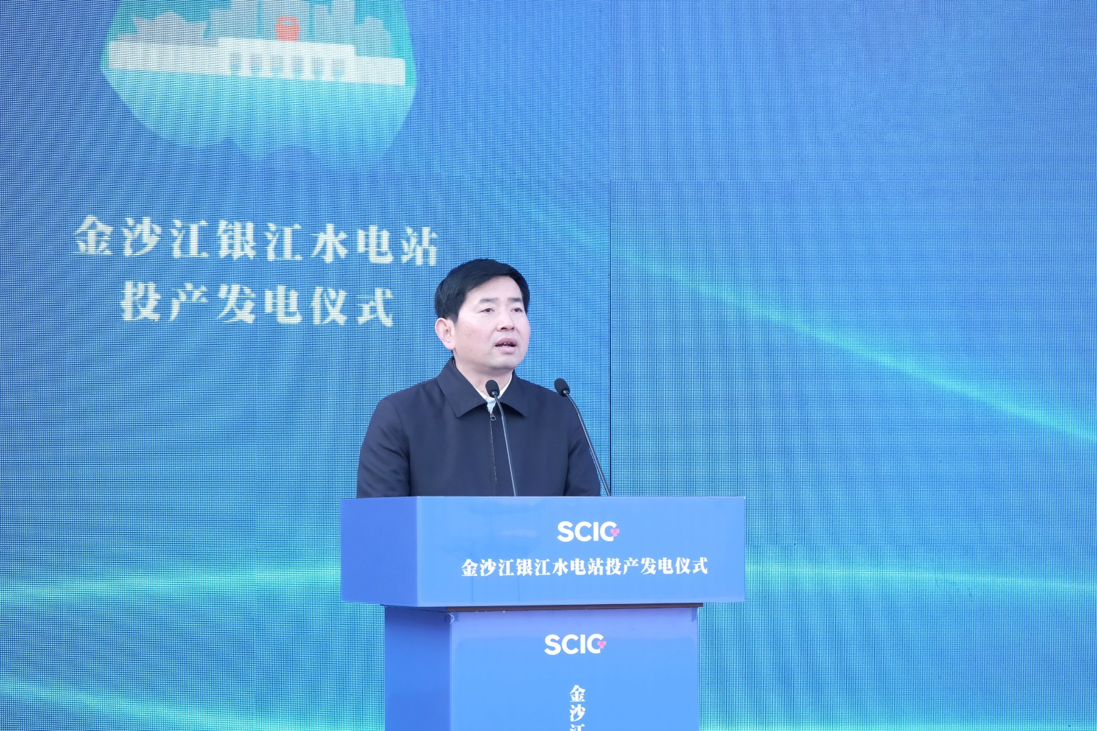 上午9时许,,,,,,,,随着仪式现场下达首台机组开机发电指令,,,,,,,,吴群刚、吴晓曦、范继跃、李文志、林开国、李仁杰等向导按下启动柱,,,,,,,,配合启动金沙江银江水电站投产发电,,,,,,,,标记着该水电站提前一年实现投产发电目的。。。。。。。