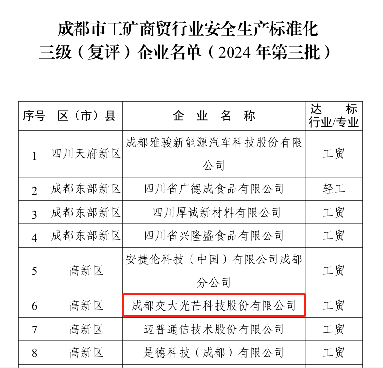 2024Äê9Ô£¬£¬£¬£¬£¬£¬³É¶¼»áÓ¦¼±¾ÖÐû²¼¡¶¹ØÓÚÐû²¼³É¶¼»á¹¤¿óÉÌóÐÐÒµÇå¾²Éú²ú±ê×¼»¯Èý¼¶£¨¸´ÆÀ£©ÆóÒµÃûµ¥£¨2024ÄêµÚÈýÅú£©µÄ֪ͨ¡·£¬£¬£¬£¬£¬£¬½»´ó¹âÏßͨ¹ýÇå¾²Éú²ú±ê×¼»¯Èý¼¶´ï±ê¸´ÆÀ¡£¡£ ¡£¡£¡£¡£